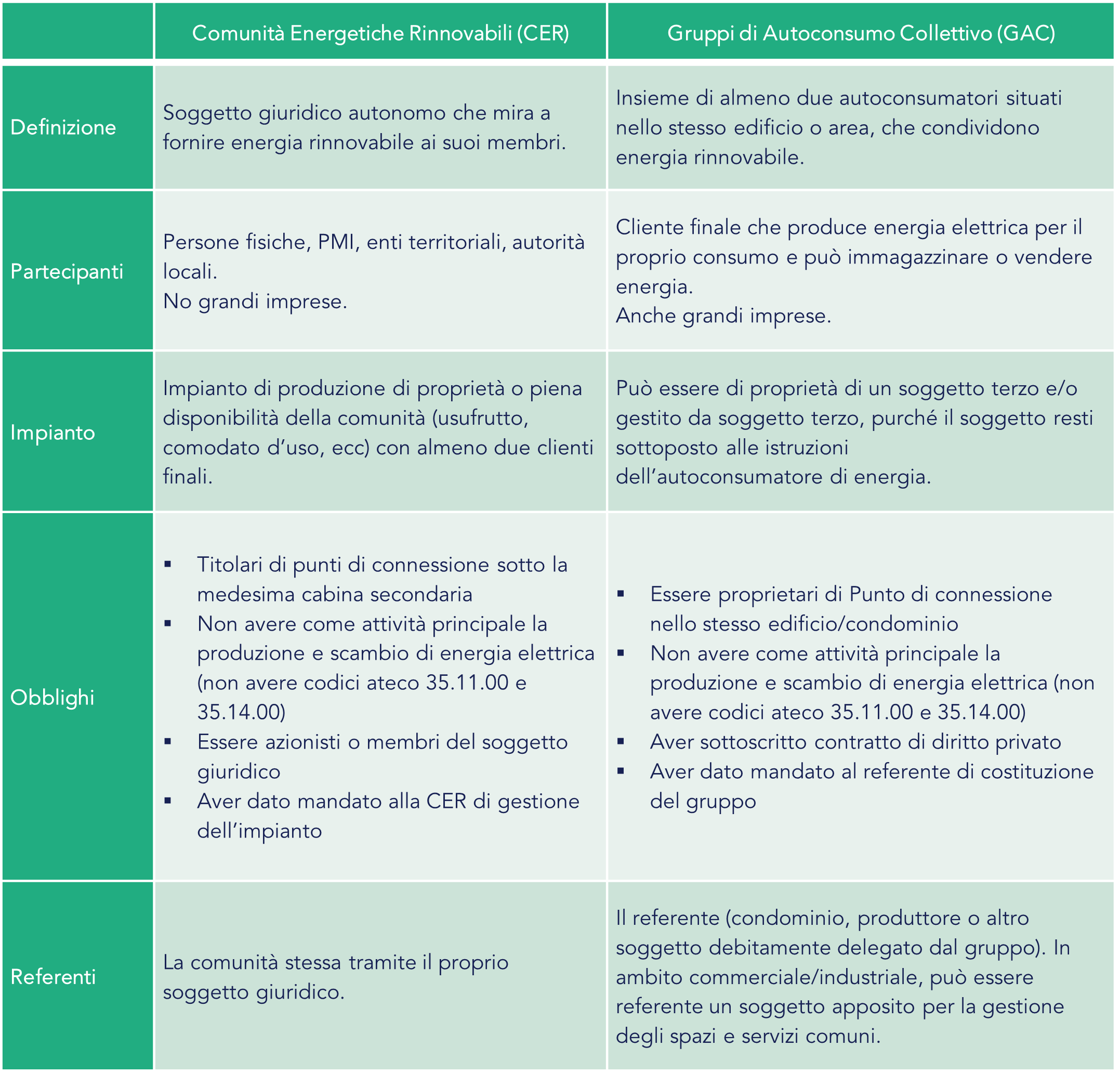 GreenFlex Notizia Blog Comunità Energetiche Rinnovabili Comunità Energetiche Rinnovabili: funzionamento, incentivi e come realizzarle L’evoluzione verso un sistema energetico più sostenibile e decentralizzato ha portato alla nascita di nuovi modelli di produzione e consumo di energia, tra cui le Comunità Energetiche Rinnovabili (CER), i Gruppi di Autoconsumo Collettivo (GAC) e l’autoconsumo individuale a distanza. Questi modelli non solo mirano a ridurre l’impronta carbonica e i costi energetici, ma cercano anche di democratizzare l’accesso all’energia, coinvolgendo attivamente cittadini, imprenditori, amministratori e comunità locali nella transizione energetica. Indice Cosa sono le Comunità Energetiche Rinnovabili (CER) Vantaggi delle Comunità Energetiche Rinnovabili Differenza tra CER e GAC Autoconsumo a distanza Incentivi economici per CER, GAC e autoconsumo a distanza Fasi per realizzare una Comunità Energetica Rinnovabile Esempio di Comunità Energetica Rinnovabile: un progetto GreenFlex Cosa sono le Comunità Energetiche Rinnovabili (CER) Una CER è un’entità giuridica che consente ai suoi membri di produrre, consumare, condividere e vendere energia rinnovabile all’interno di una comunità locale. L’obiettivo è quello di promuovere l’autoconsumo e migliorare l’efficienza energetica, riducendo al contempo i costi energetici e l’impatto ambientale. Chi può fare una Comunità Energetica? Le CER possono essere composte da gruppi di cittadini, condomini, piccole e medie imprese, cooperative, enti locali o altre organizzazioni che collaborano per generare energia rinnovabile da fonti green, come gli impianti fotovoltaici. Vantaggi delle Comunità Energetiche Rinnovabili Creare una CER è vantaggioso perché i partecipanti ottengono: Benefici Ambientali Le CER contribuiscono in modo significativo alla riduzione delle emissioni di CO2 e si pongono come sistemi ecosostenibili per la produzione di energia pulita. Benefici Economici I membri beneficiano di una riduzione delle spese energetiche attraverso la minimizzazione o l’azzeramento dei prelievi dalla rete e l’accesso a incentivi dedicati alla comunità. Benefici Sociali La creazione di nuove opportunità di lavoro locali, l’aumento dell’indipendenza energetica, la promozione della sostenibilità e l’uso razionale dell’energia sono solo alcuni degli aspetti promossi dalle CER che rafforzano il tessuto sociale ed economico di un territorio. Per saperne di più, scarica il PDF Differenza tra CER e GAC Requisiti Almeno 2 punti di connessione à uno di consumo, uno di produzione; Impianti localizzati nelle aree di piena disponibilità dell’autoconsumatore; Punti di connessione sotto la stessa cabina primaria; L’autoconsumatore può essere anche Grande Impresa; Autoconsumo a distanza Cos’è Configurazione che prevede un unico cliente finale che utilizza la rete di distribuzione per la condivisione di energia prodotta da impianti a fonti rinnovabili situati nelle aree di sua piena disponibilità e autoconsumarla virtualmente nei punti di prelievo dei quali è titolare. Contributi economici Tariffa Premio sull’energia condivisa; Valorizzazione per le perdite di trasmissione, definite da ARERA; RID o vendita sul mercato libero. Per saperne di più, scarica il PDF Incentivi economici per CER, GAC e autoconsumo a distanza Gli incentivi riconosciuti Tariffa premio fino a 130 €/MWh; Compensazione oneri da circa 8 €/MW (in base alla configurazione) Valorizzazione Energia ≈80 €/MWh (secondo il prezzo zonale orario); Risparmio da autoconsumo ≈180 €/MWh (valori stimati 2023 per utenze commerciali); Detrazione fiscale 50%. Fasi per realizzare una Comunità Energetica Rinnovabile Il percorso necessario per creare una CER è composto da una serie di step che vanno dallo studio di fattibilità alla presentazione del progetto, dalla costituzione della comunità alla realizzazione dell’impianto, dall’avvio della richiesta GSE alla gestione e manutenzione del sistema. Nella seguente grafica sono riportati nel dettaglio tutti i passaggi. Per saperne di più, scarica il PDF Esempio di Comunità Energetica Rinnovabile: un progetto GreenFlex Il team di GreenFlex si è occupato della realizzazione della Comunità Energetica Rinnovabile “Edificio 16”, con l’obiettivo di creare un impianto fotovoltaico da 400 kWp per l’autoconsumo della struttura. Il supporto dei nostri professionisti in questo progetto si è concretizzato nelle seguenti attività: Valutazione della superficie di copertura utilizzabile; Stima del potenziale di produzione e del progetto fotovoltaico; Analisi della curva di consumo energetico del sito; Redazione dello Studio di fattibilità tecnico-economico dei risparmi generabili e delle emissioni di CO₂ evitabili; Supporto alla costituzione della Comunità Energetica; Progettazione esecutiva e direzione lavori specialistica; Realizzazione «chiavi in mano»; Gestione con formula full Operation & Maintenance. Il nostro approccio integrato e la gestione a 360° del progetto si sono dimostrati elementi chiave per creare una CER senza problemi e ottenere eccellenti risultati nel corso degli anni. Leggi l’intera referenza Desideri approfondire i dettagli sulla creazione delle Comunità Energetiche Rinnovabili? I nostri specialisti hanno creato un materiale dedicato dai nostri studi 2023 e 2024, scaricalo qui: Scarica il PDF